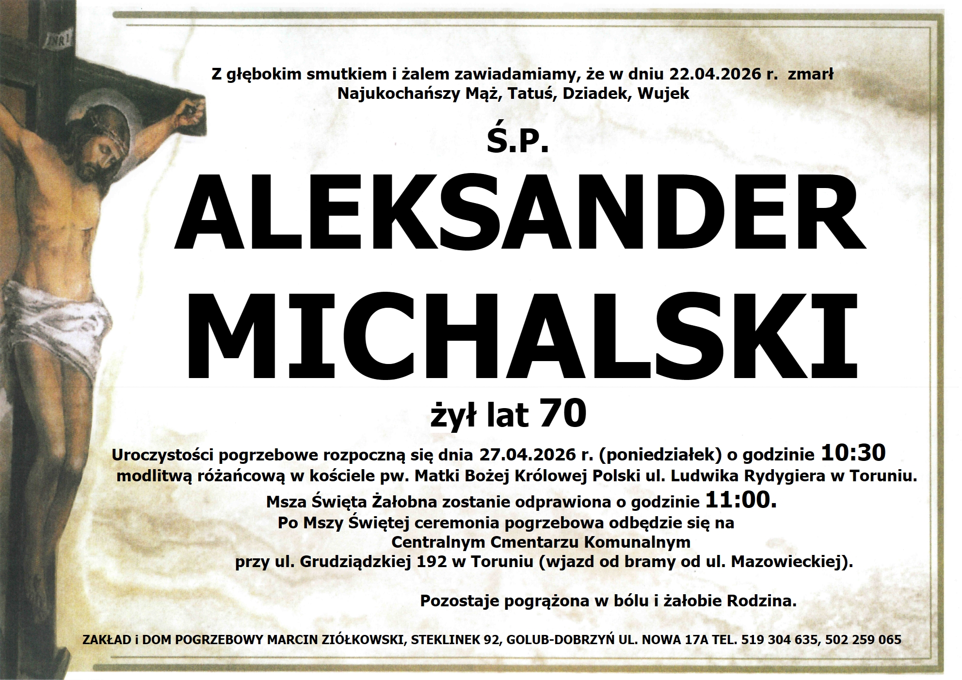 Z żalem informuję, że nie żyje ALEKSANDER MICHALSKI. Pogrzeb odbędzie się 27.04.2026. Lokalizacja: Centralny Cmentarz Komunalny ul. Grudziądzka 192 (wjazd od bramy od ul. Mazowieckiej).. Więcej informacji na stronie https://pogrzebyziolkowski.pl/nekrolog/aleksander-antoni-michalski/