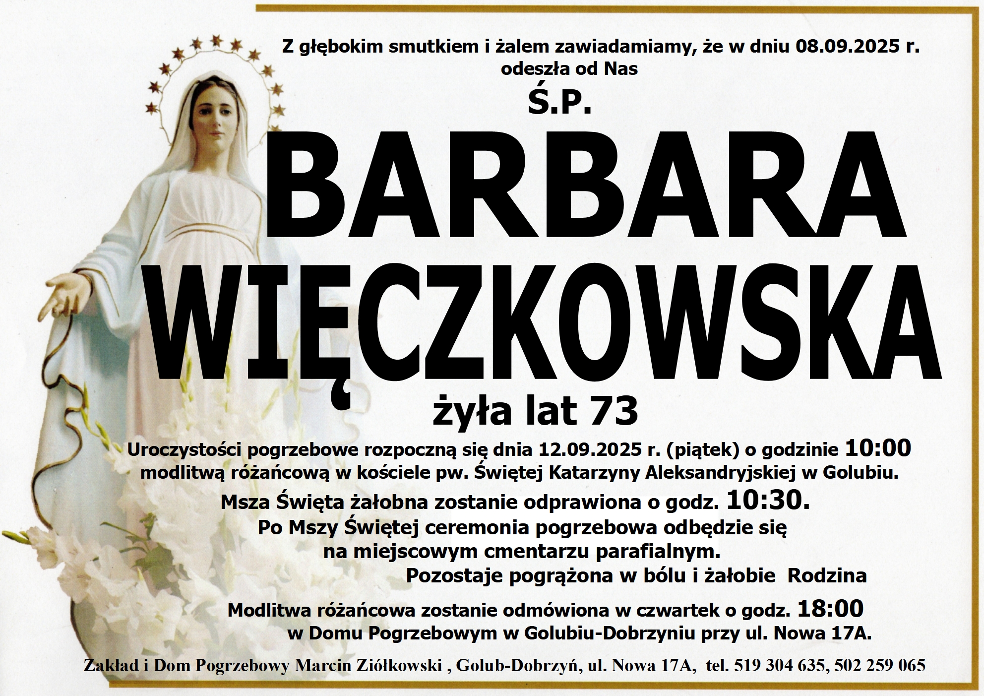 Ceremonia pożegnalna: 12.09.2025 o godz. 10:00 p.w. Świętej Katarzyny Aleksandryjskiej w Golubiu