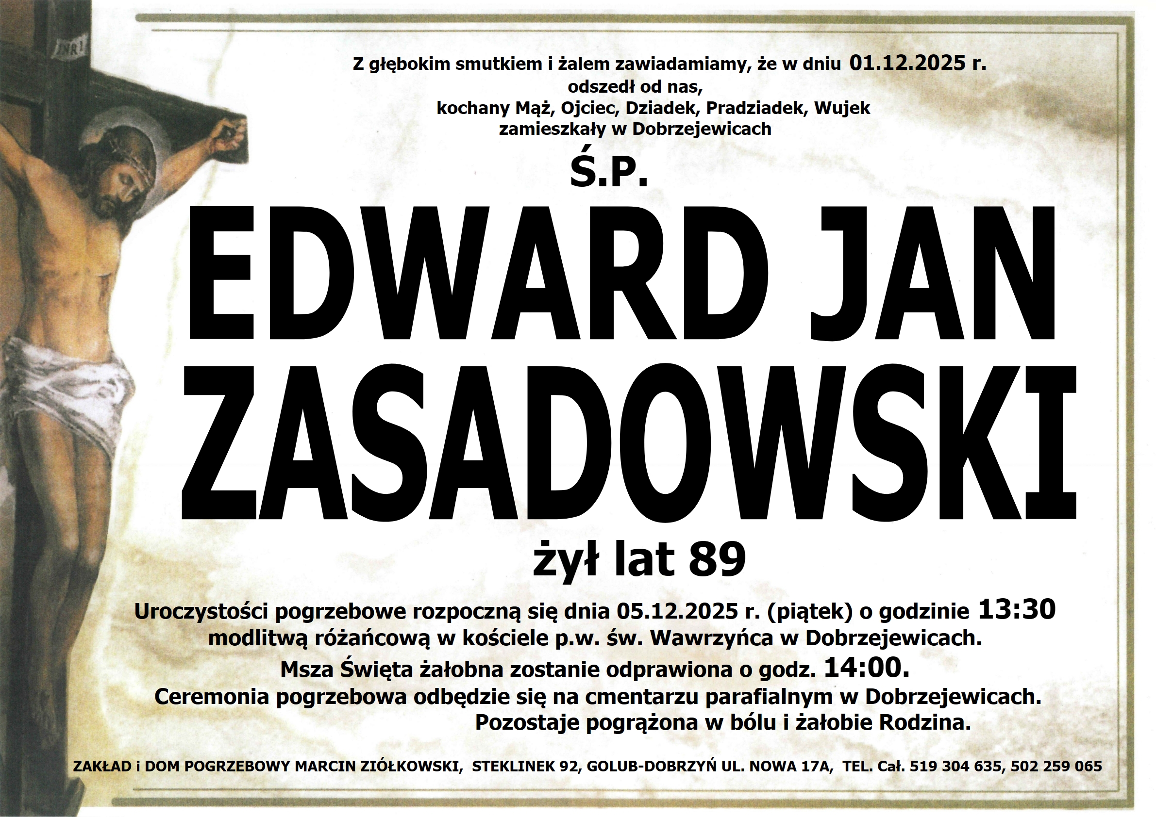 Ceremonia pożegnalna: 05.12.2025 o godz. 13:30 w kościele p.w. Św. Wawrzyńca w Dobrzejewicach
