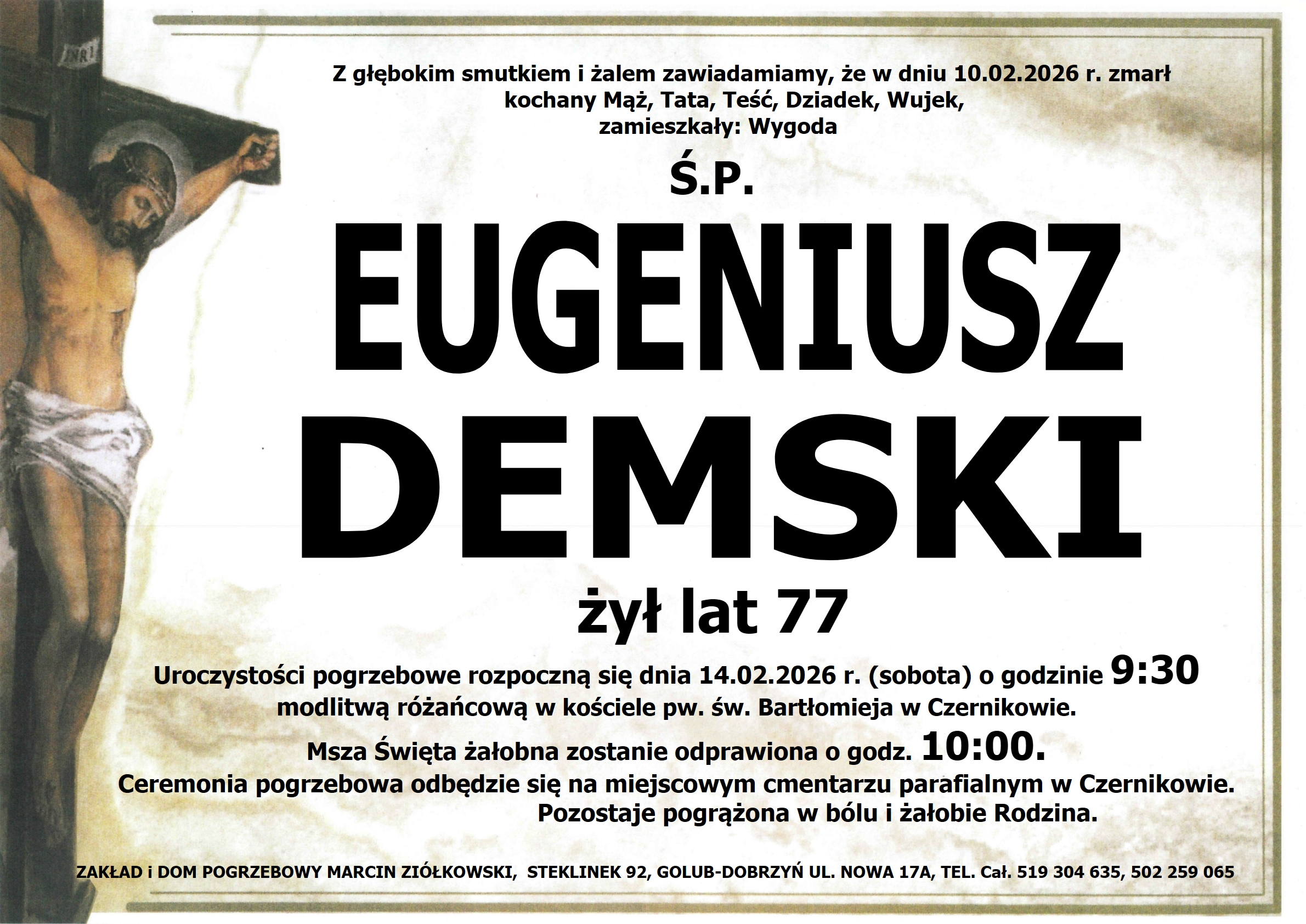 Ceremonia pożegnalna: 14.02.2026 o godz. 09:30 Kościół św. Bartłomieja w Czernikowie