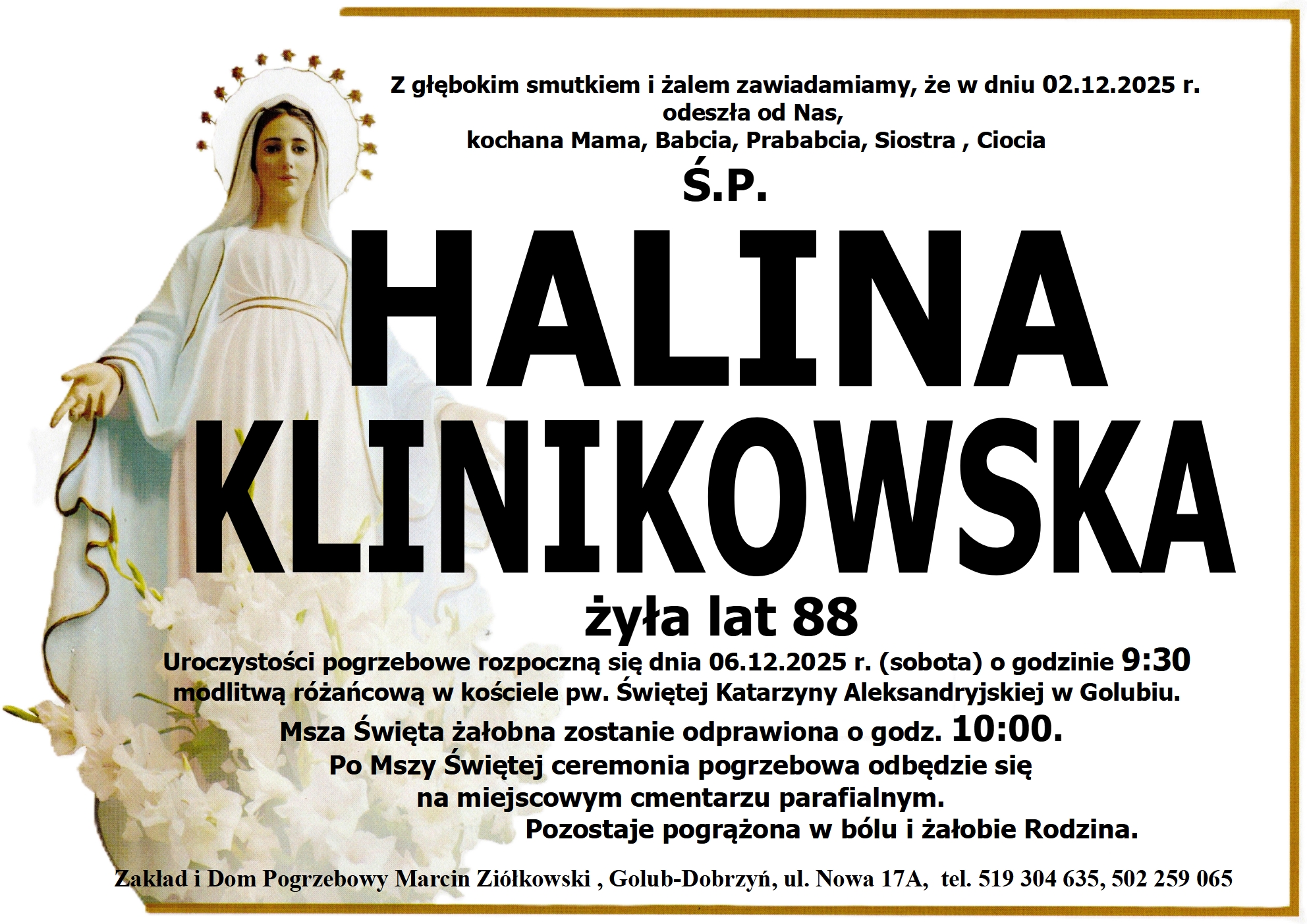 Z żalem informuję, że nie żyje HALINA KLINIKOWSKA. Pogrzeb odbędzie się 06.12.2025. Lokalizacja: cmentarzu parafialnym w Golubiu. Więcej informacji na stronie https://pogrzebyziolkowski.pl/nekrolog/halina-klinikowska/