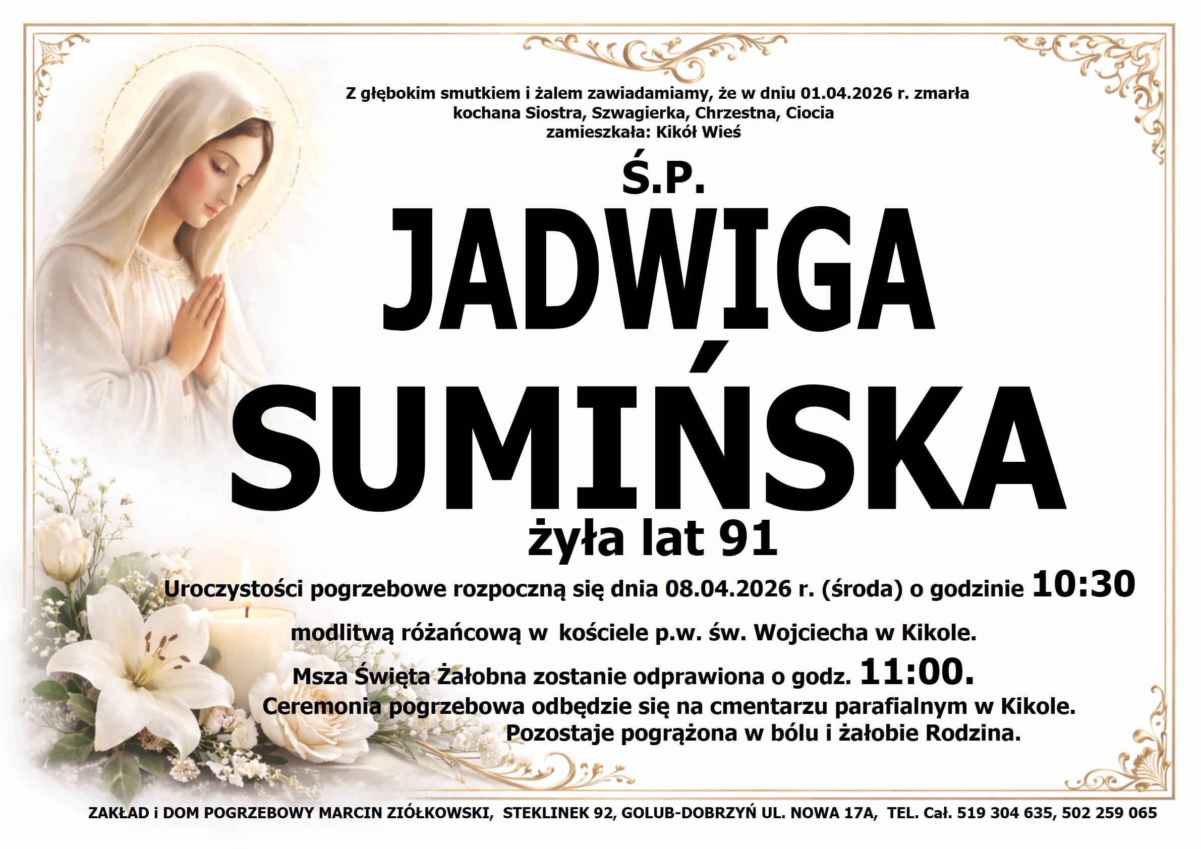 Data pogrzebu: 08.04.2026 Ceremonia pożegnalna: 08.04.2026 o godz. 10:30 kościół p.w. Św. Wojciecha w Kikole Kikół, ul. Sienkiewicza 2 Msza Święta: 08.04.2026 o godz. 11:00 kościół p.w. Św. Wojciecha w Kikole Kikół, ul. Sienkiewicza 2 Wyprowadzenie do grobu o godz. 11:45 Cmentarz: Cmentarz parafialny w Kikole Kikół, ul. Sienkiewicza 2