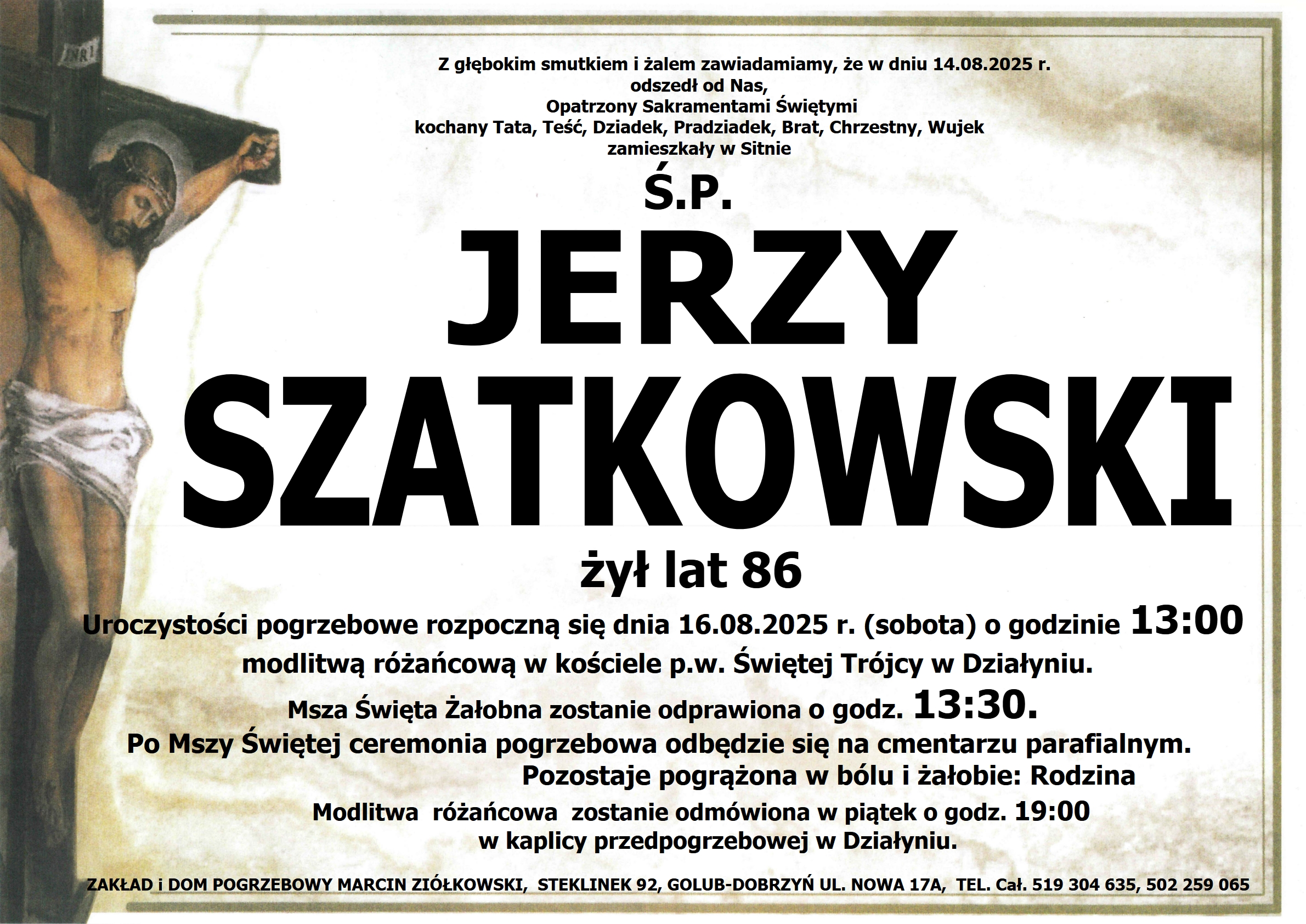 Ceremonia pożegnalna: 16.08.2025 o godz. 13:00 kościół p.w. Świętej Trójcy w Działyniu