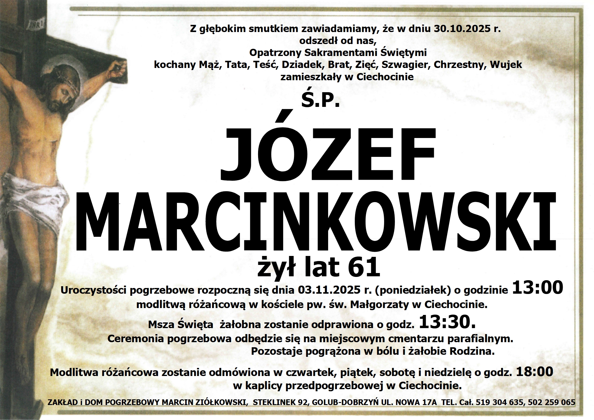 Ceremonia pożegnalna: 03.11.2025 o godz. 13:00 kościół p.w. Św. Małgorzaty w Ciechocinie