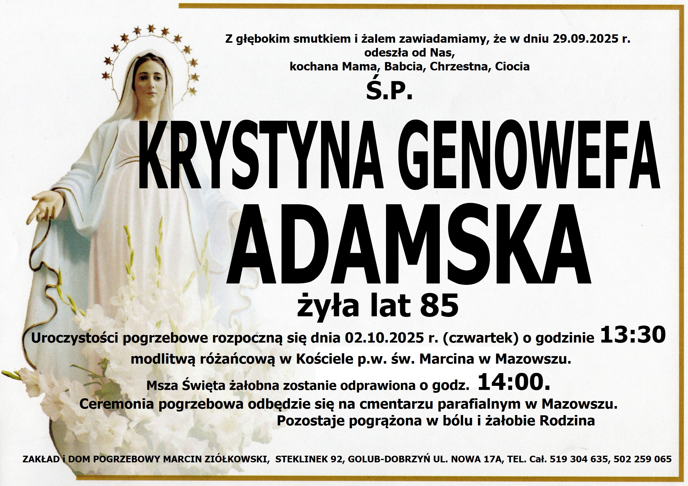 Ceremonia pożegnalna: 02.10.2025 o godz. 13:30 kościół pw. Św. Marcina w Mazowszu