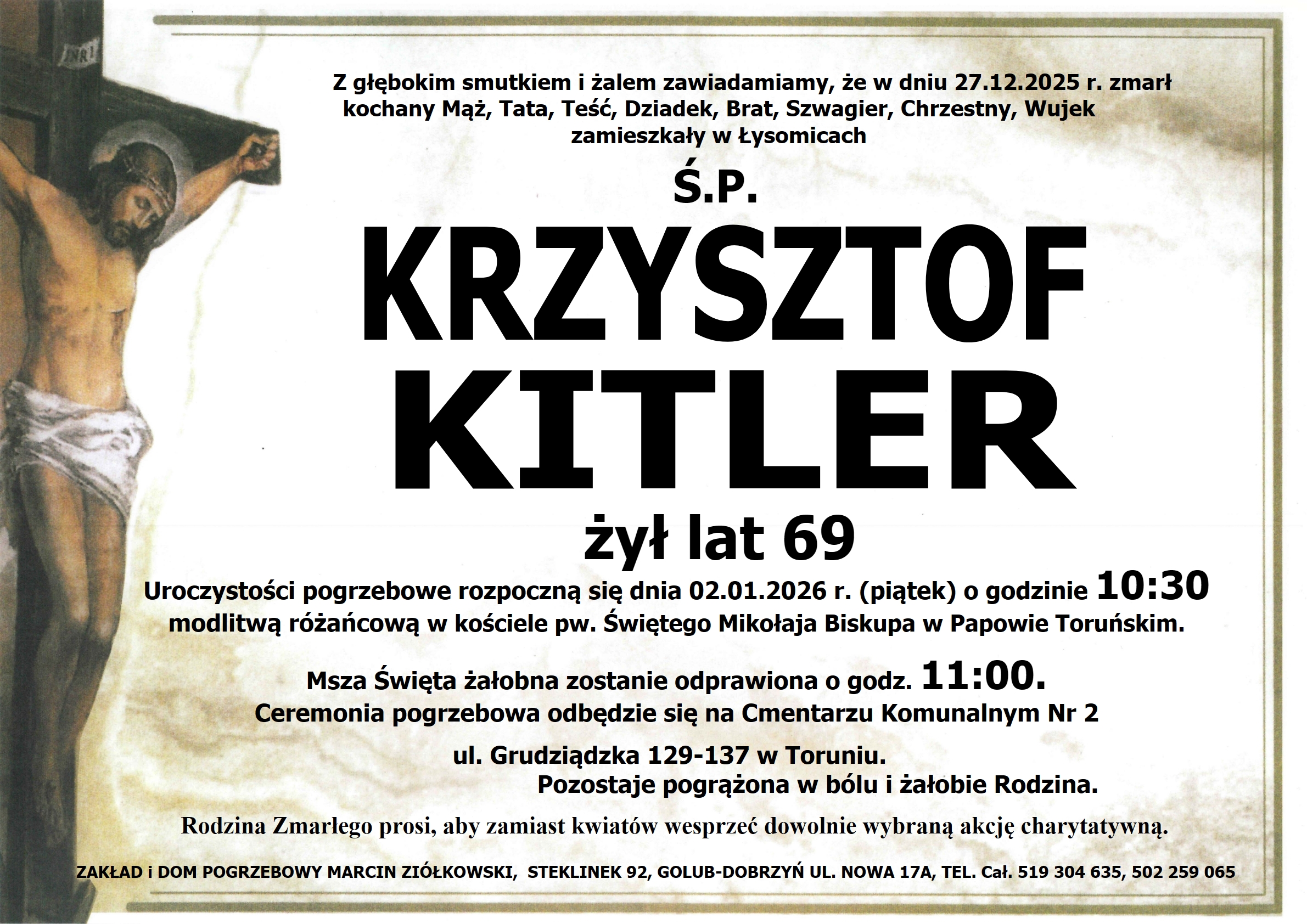 Rodzina Zmarłego prosi, aby zamiast kwiatów wesprzeć dowolnie wybraną akcję charytatywną.