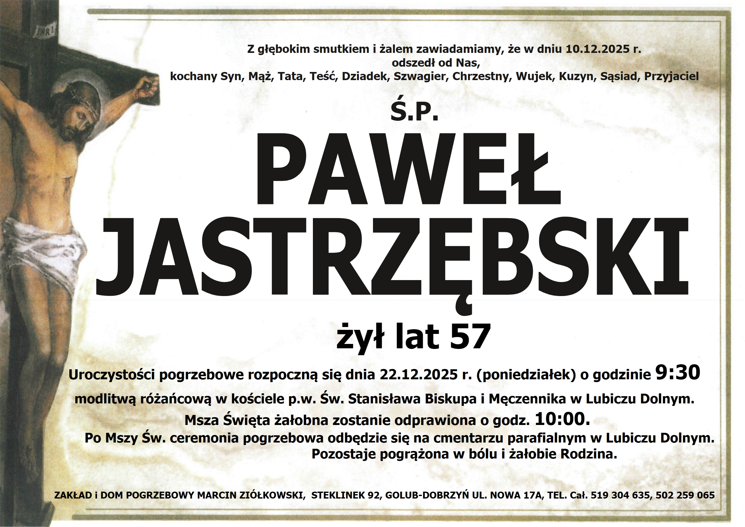 Z żalem informuję, że nie żyje PAWEŁ JASTRZĘBSKI. Pogrzeb odbędzie się 22.12.2025. Lokalizacja: Cmentarz parafialny w Lubiczu Dolnym. Więcej informacji na stronie https://pogrzebyziolkowski.pl/nekrolog/pawel-jastrzebski/