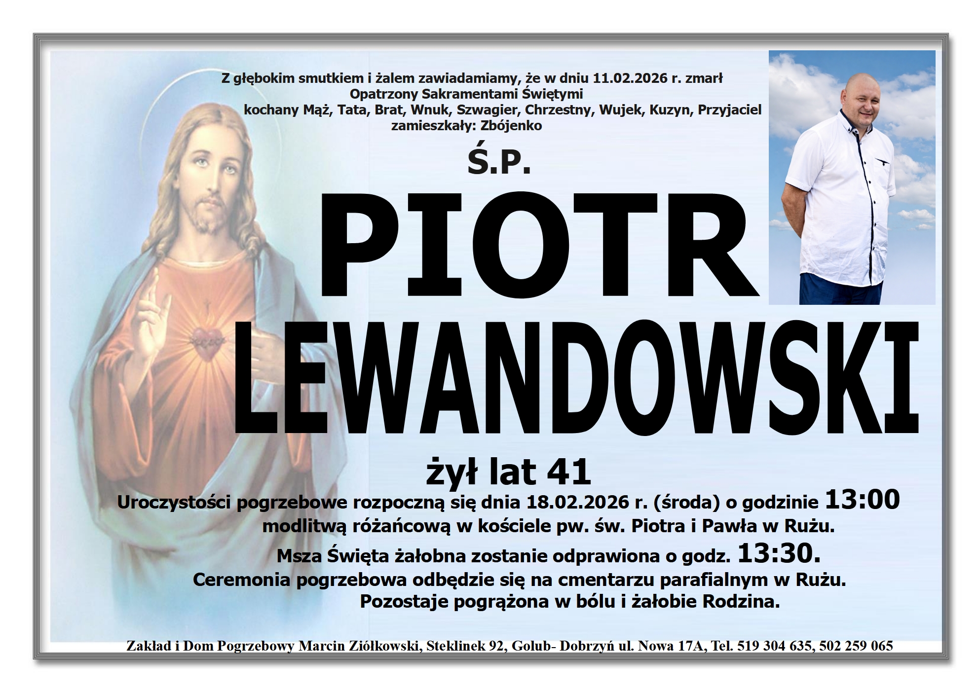 Z żalem informuję, że nie żyje PIOTR LEWANDOWSKI. Pogrzeb odbędzie się 18.02.2026. Lokalizacja: Cmentarz parafialny w Rużu. Więcej informacji na stronie https://pogrzebyziolkowski.pl/nekrolog/piotr-lewandowski/