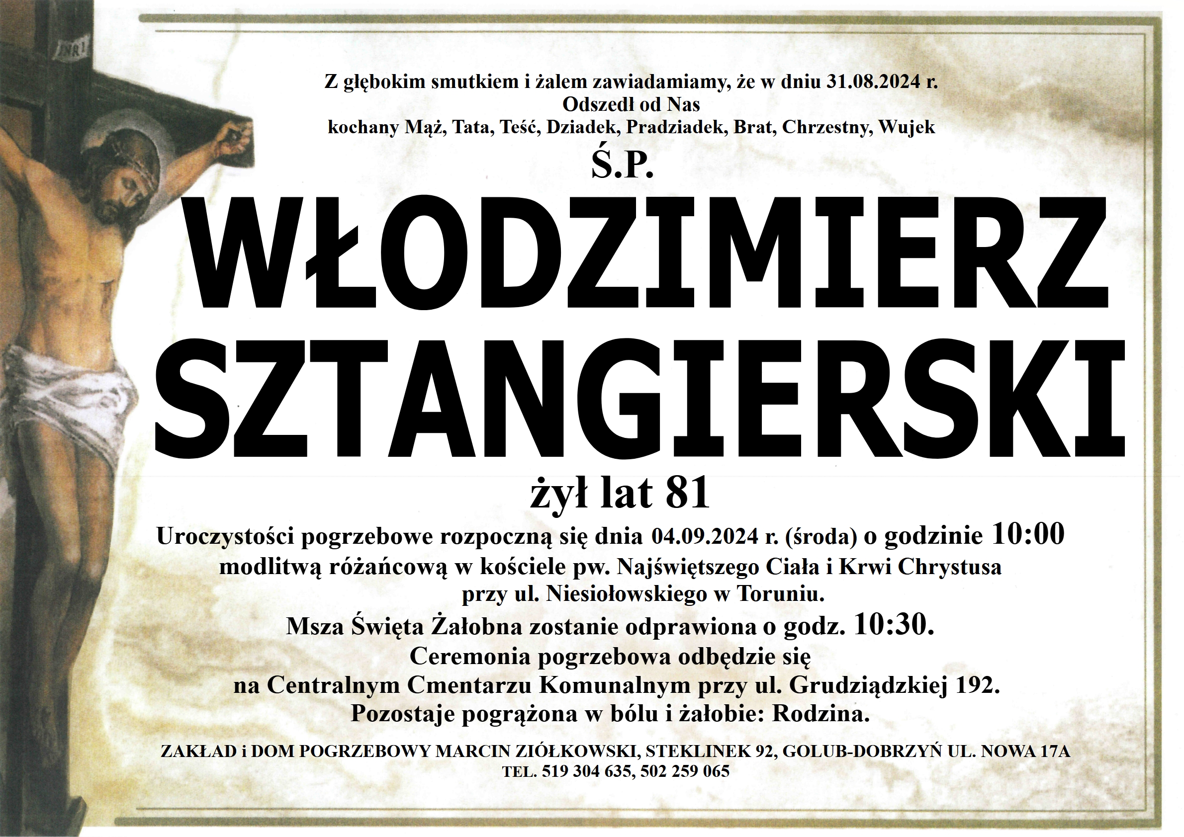 Z żalem informuję, że nie żyje WŁODZIMIERZ SZTANGIERSKI. Pogrzeb odbędzie się 04.09.2024. Lokalizacja: Centralny Cmentarz Komunalny ul. Grudziądzka 192. Więcej informacji na stronie https://pogrzebyziolkowski.pl/nekrolog/wlodzimierz-sztangierski/